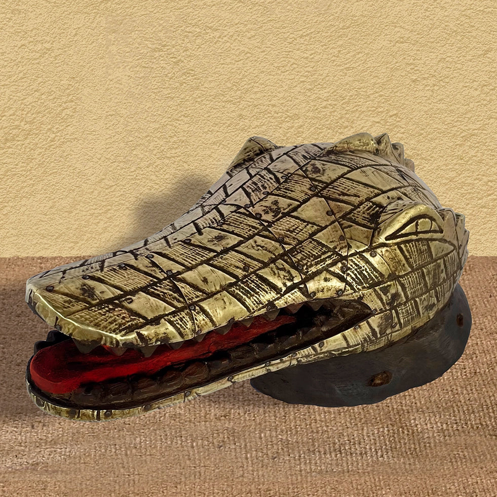The two charismatic head masks, a crocodile and a ram, are made of wood and covered in hammered brass. They are inspired by traditional helmet masks from Paga in northern Ghana and the Ivory Coast.