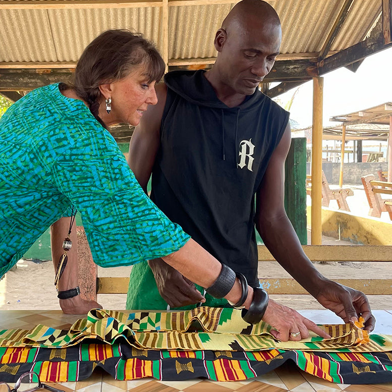 The friezes and wall décor are inspired by Ashanti culture. The elegant wall panels are carved from solid wood and framed with Kente textiles. They are adorned either with an Adinkra symbol or beautiful hand-hammered metalwork.